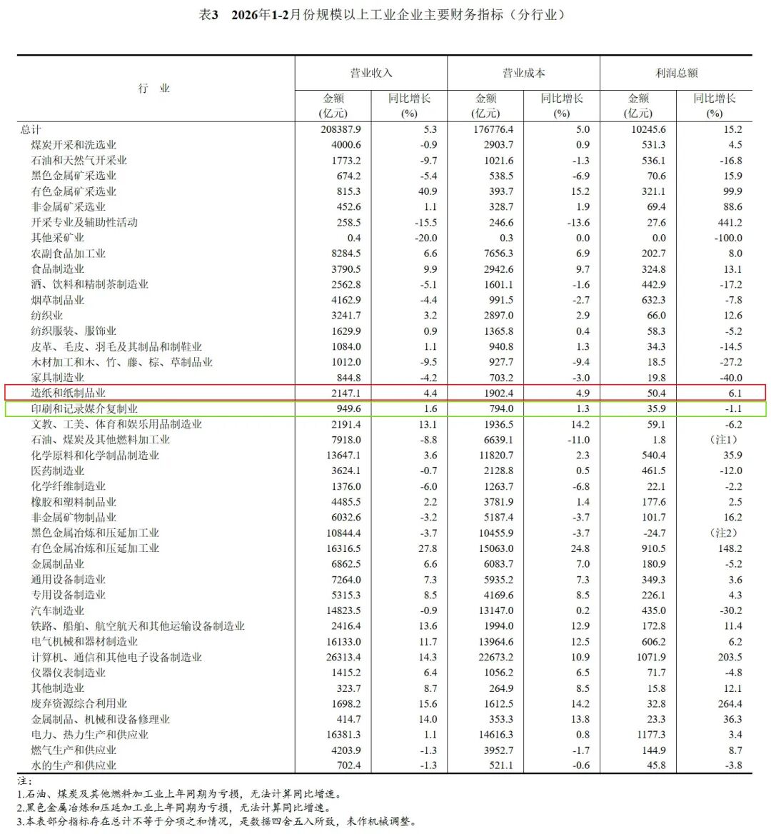 1—2月份,規(guī)模以上工業(yè)企業(yè)實(shí)現(xiàn)營業(yè)收入20.84萬億元,同比增長5.3%;發(fā)生營業(yè)成本17.68萬億元,增長5.0%;營業(yè)收入利潤率為4.92%,同比上升0.43個百分點(diǎn)。其中,造紙和紙制品業(yè)實(shí)現(xiàn)營業(yè)收入2147.1億元,同比增長4.4%;印刷和記錄媒介復(fù)制業(yè)實(shí)現(xiàn)營業(yè)收入949.6億元,同比增長1.6%。 2月末,規(guī)模以上工業(yè)企業(yè)資產(chǎn)總計188.40萬億元,同比增長5.5%;負(fù)債合計108.59萬億元,增長5.8%;所有者權(quán)益合計79.82萬億元,增長5.1%;資產(chǎn)負(fù)債率為57.6%,同比上升0.1個百分點(diǎn)。 2月末,規(guī)模以上工業(yè)企業(yè)應(yīng)收賬款26.55萬億元,同比增長7.1%;產(chǎn)成品存貨6.68萬億元,增長6.6%。 1—2月份,規(guī)模以上工業(yè)企業(yè)每百元營業(yè)收入中的成本為84.83元,同比減少0.24元;每百元營業(yè)收入中的費(fèi)用為8.66元,同比增加0.02元。 2月末,規(guī)模以上工業(yè)企業(yè)每百元資產(chǎn)實(shí)現(xiàn)的營業(yè)收入為66.4元,同比減少0.1元;人均營業(yè)收入為174.9萬元,同比增加9.5萬元;產(chǎn)成品存貨周轉(zhuǎn)天數(shù)為22.7天,同比增加0.4天;應(yīng)收賬款平均回收期為76.4天,同比增加1.3天。 國家統(tǒng)計局工業(yè)司首席統(tǒng)計師于衛(wèi)寧解讀2026年1—2月份工業(yè)企業(yè)利潤數(shù)據(jù)表示,1—2月份,各地區(qū)各部門加緊實(shí)施更加積極有為的宏觀政策,著力發(fā)揮存量政策和增量政策的集成效應(yīng),規(guī)模以上工業(yè)企業(yè)利潤增長加快,多數(shù)行業(yè)利潤回升,裝備制造業(yè)和高技術(shù)制造業(yè)利潤快速增長,工業(yè)企業(yè)效益狀況呈現(xiàn)持續(xù)恢復(fù)態(tài)勢。總體看,規(guī)模以上工業(yè)企業(yè)利潤增長較快,但也要看到,國際環(huán)境跌宕起伏,外部風(fēng)險特別是地緣政治沖突外溢風(fēng)險上升,不穩(wěn)定不確定性因素較多,同時國內(nèi)經(jīng)濟(jì)轉(zhuǎn)型期行業(yè)企業(yè)利潤恢復(fù)仍不均衡。下階段,要深入貫徹落實(shí)中央經(jīng)濟(jì)工作會議精神和全國兩會部署,持續(xù)擴(kuò)大內(nèi)需、優(yōu)化供給,因地制宜發(fā)展新質(zhì)生產(chǎn)力,縱深推進(jìn)全國統(tǒng)一大市場建設(shè),推動工業(yè)經(jīng)濟(jì)持續(xù)健康發(fā)展。