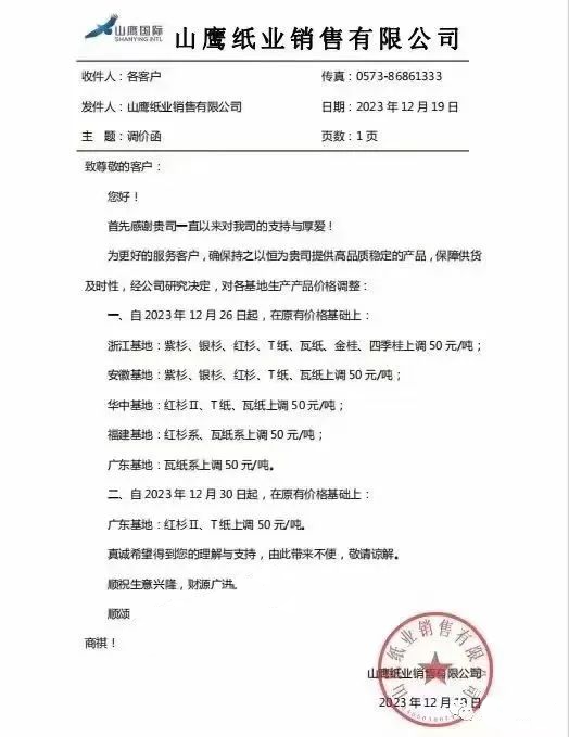 山鷹國際計劃下旬上調箱板紙、瓦楞紙價格(2023-12-20)