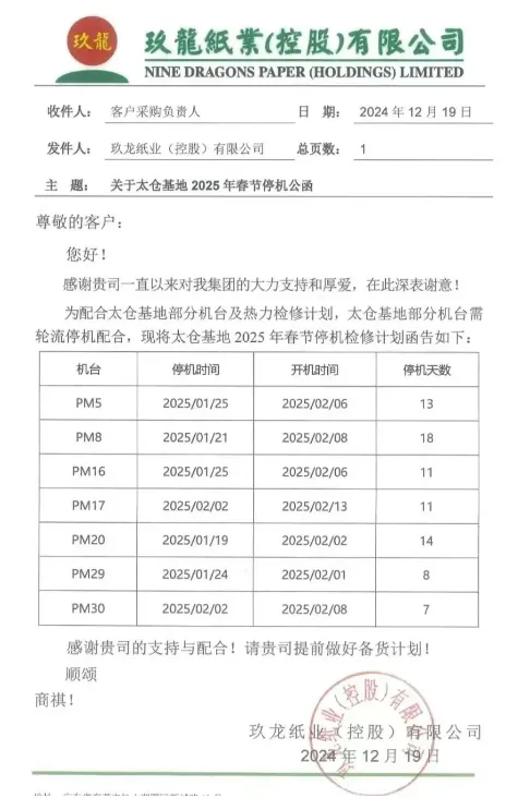 12月19日,東莞玖龍發布了2025年春節停機檢修計劃,該基地14臺紙機將在2025年1月底至2月中旬期間輪停8-16天,預計減產17.5萬噸包裝紙,其中包括13.8萬噸箱板瓦楞紙和3.7萬噸白板紙。