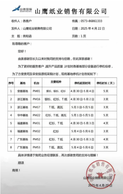 山鷹紙業(yè)提前發(fā)布了五一假期停機檢修安排,通知顯示,山鷹安徽、浙江、福建、廣東、華東基地將在4月30日-5月6日期間將停機3-5天不等。