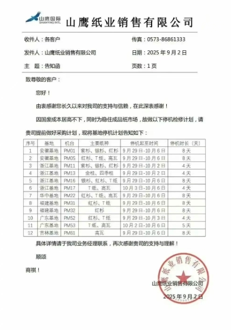 山鷹紙業本次停機計劃共涉及六大生產基地12條造紙生產線,停機時長為4-8天,停機時間集中在9月29日-10月6日期間。此次停機影響產品主要是箱板紙和瓦楞紙,合計影響產能預計約9.7萬噸。