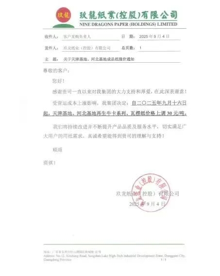 玖龍紙業(yè)天津基地、河北基地:自九月十六日起,天津基地、河北基地再生牛卡系列、瓦楞紙價(jià)格上調(diào)30元/噸。