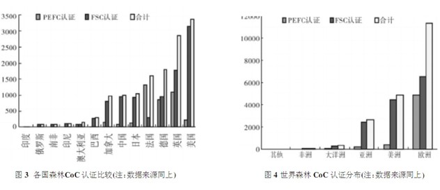 監管鏈認證是指對森林產品從源頭到加工與分布配置的所有過程進行跟蹤。當前,世界上由不同認證體系認證的森林產品監管鏈的企業超過2萬家。到2009年6月15日,由FSC認證體系認證的企業數為13706家;到2009年7月31日,由PEFC認證體系認證的企業數為5578家。然而,由FSC認證的企業數分布在世界不同地區的96個國家,而由PEFC認證的企業數主要分布在歐美等地區的46個國家,無論是認證數量還是地理分布都有一定的差距。