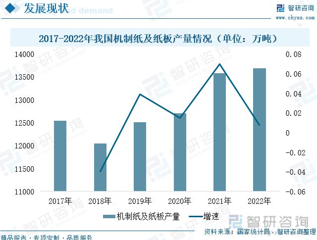 機制紙及紙板廣泛用于多個領域,國家統計局數據顯示,2018-2022年,我國機制紙及紙板產量穩步上漲。2022年全國生產機制紙及紙板13691.4萬噸,同比增長0.79%,行業延續增長態勢,國內巨大的紙張需求為造紙設備提供了廣闊的發展空間。