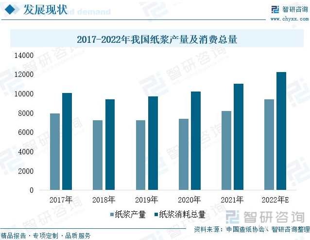 三、下游市場穩健發展,行業需求潛力巨大 下游市場對造紙設備行業發展具有重要促進作用,下游產業不斷擴張有利于本行業市場開拓與產品研發。其中,紙漿是造紙工業中最重要的原材料,紙漿生產設備品類較多,主要包括磨漿機、分切復卷機、干燥漿板機、壓縮機等多個造紙設備。2017-2022年,我國紙漿產量及消費量不斷增加。2021年我國紙漿產量及消費總量分別增長10.83%和7.94%。2022年隨著下游用紙需求不斷增加,紙漿產量及消費量延續增速,同比增速約為15%和10.85%。未來,隨著國內制漿生產線規模不斷擴大及對制漿質量要求不斷提高,紙漿制造設備需求將進一步上漲。