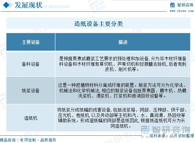 相關報告:智研咨詢發布的《2023-2029年中國造紙設備行業運營現狀及市場分析預測報告》 二、行業自主創新能力不斷加強,設備國產化進程加快 造紙產業是與國民經濟和社會事業發展關系密切的重要基礎原材料產業,紙及紙板的消費水平是衡量一個國家現代化水平和文明程度的標志。造紙設備作為造紙產業中游領域重要細分市場,其技術水平關乎到行業整體發展水平。 造紙設備主要包括粉碎設備、傳輸設備、濕漿機,擠水機、折疊機、破碎輸送機以及打包機等。根據紙漿造紙的工藝流程,造紙機械可以分為備料設備、紙漿設備、造紙機及整飾加工機械。其中,備料設備是在蒸煮或磨漿前,按蒸煮或磨漿工藝要求進行預處理和加工的設備,分為非木材纖維備料設備和木材纖維備料設備,包括切草機、切葦機、剝皮機、削片機等。制漿設備是將植物原料分離成纖維過程所用的設備,包括蒸煮器、磨木機、熱磨機、洗漿機、漂漿機、打漿機和廢液回收設備等。造紙機全套設備包括流漿箱、網部、壓榨部、烘干部、壓光機、卷紙機,以及傳動部等主機和水、真空、潤滑、熱回收等輔助系統。